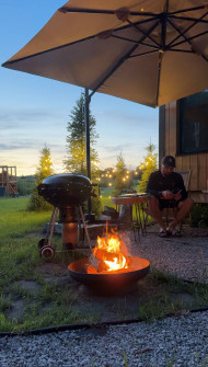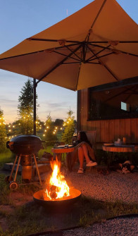Рядом с домиком обустроена патио-зона с гриль-барбекю и костровой чашей — идеальное место для вечеров у огня. Дрова, топливо для камина, полотенца, постельное бельё и пледы уже входят в стоимость проживания.