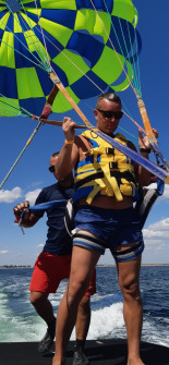 На вас надягають парашут, прив'язують довгим, міцним тросом до катера або іншого водного транспортного засобу. І, під час руху, ви злітаєте над морем прямо з катера! Політ на парашуті починається!