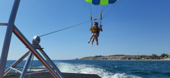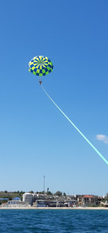 Парасейлінг - катання на парашуті за катером. Ви підіймаєтесь над водою через сили вітру на спеціальному парашуті, який прикріплений до катера.